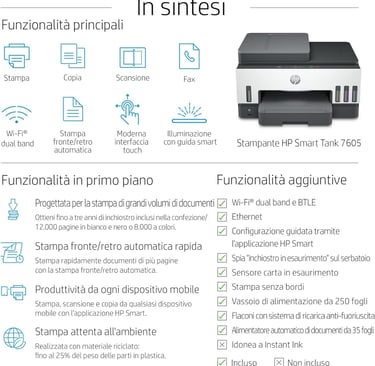 La HP Smart Tank 7605 si distingue come una stampante all’avanguardia, capace di combinare efficienza, qualità di stampa eccezionale e rispetto per l’ambiente. È la soluzione ideale per chi cerca un dispositivo affidabile, economico e versatile, capace di soddisfare le esigenze di stampa più diverse con risultati sempre impeccabili.