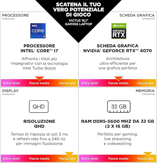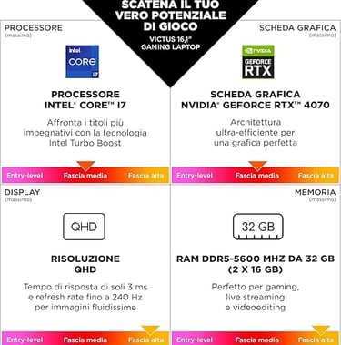 Cuore pulsante del Victus 16-r1007sl è il processore Intel Core i7-13700H di 13ª generazione. Questa CPU, dotata di 14 core e 20 thread, garantisce prestazioni straordinarie sia in ambito single-thread che multi-thread, rendendola perfetta per gestire applicazioni pesanti come software di editing video, modellazione 3D e, naturalmente, i giochi più esigenti. La frequenza di clock, che può raggiungere i 5.0 GHz in modalità turbo, assicura una risposta rapida anche durante le sessioni di lavoro più intense.